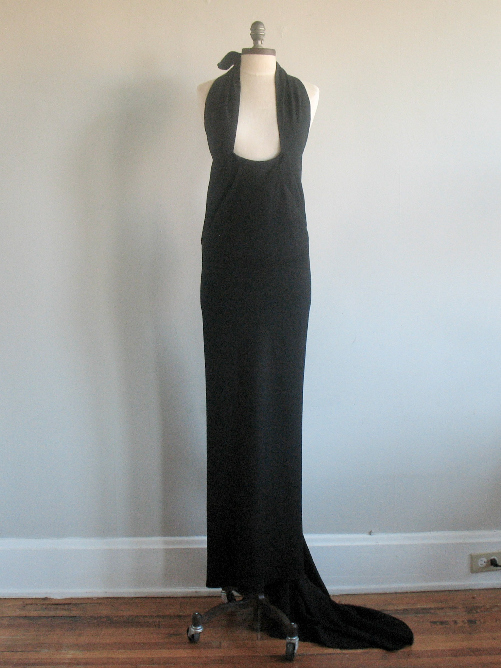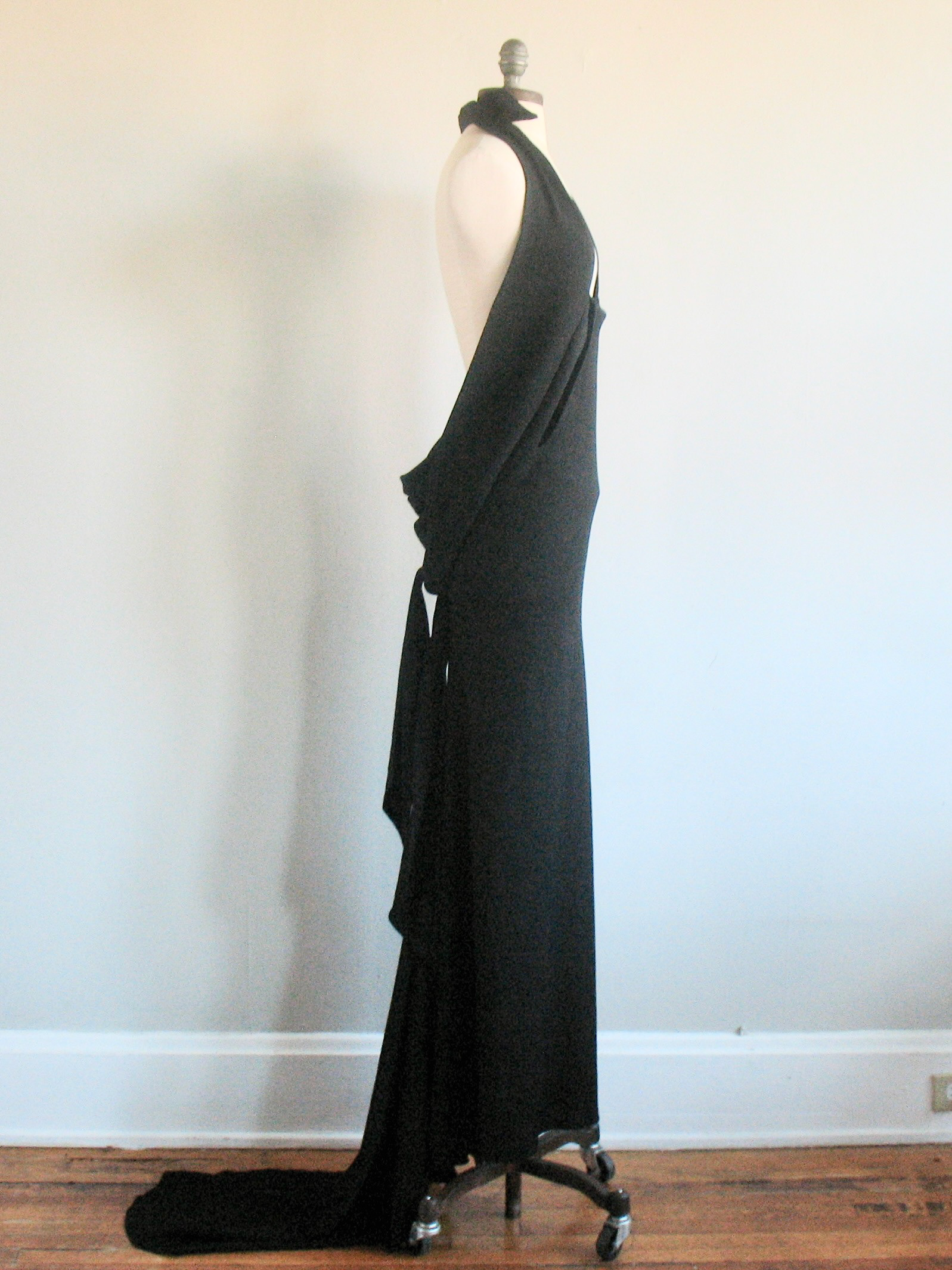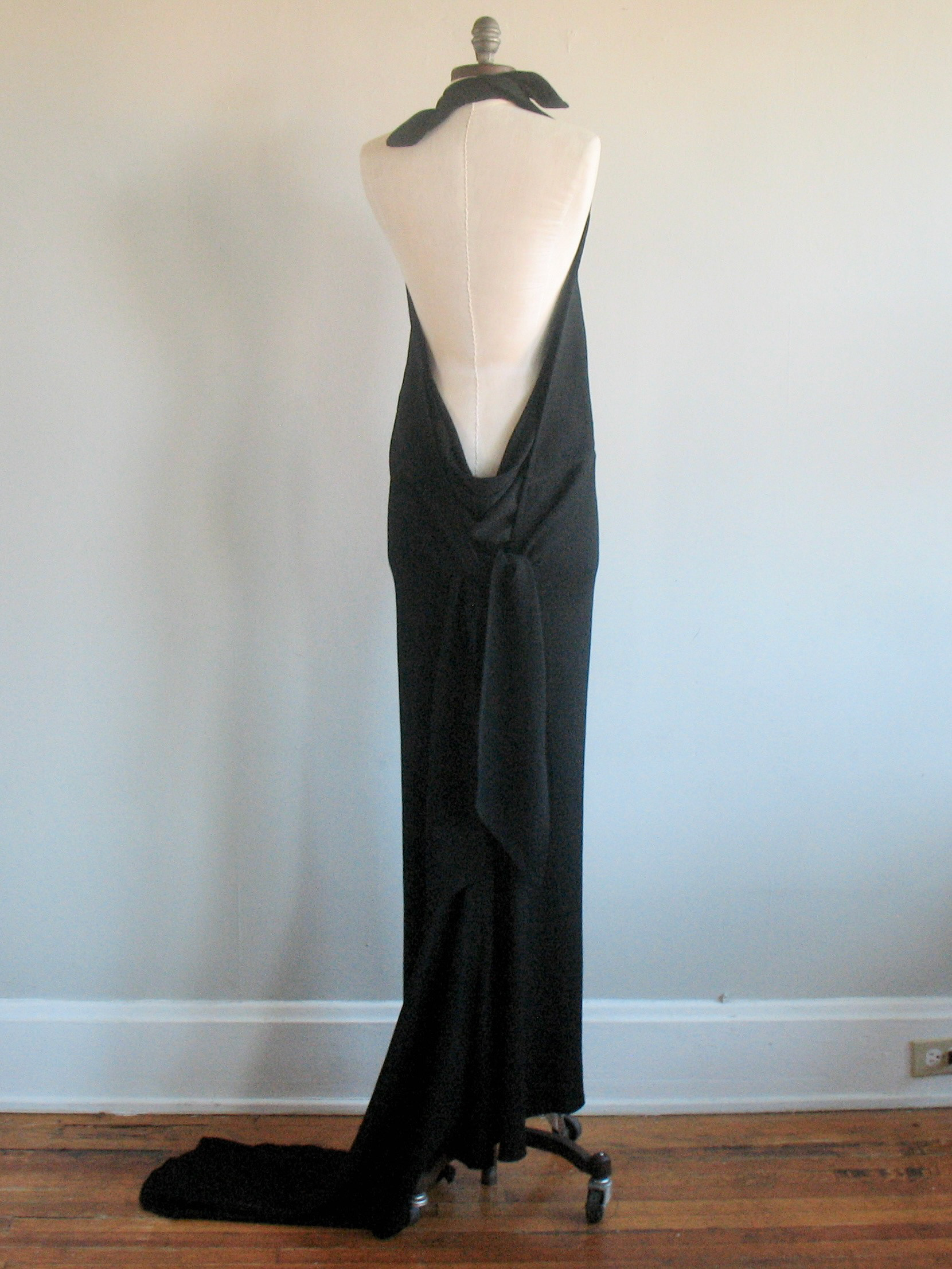 • Silk panels tie in back to comprise bodice