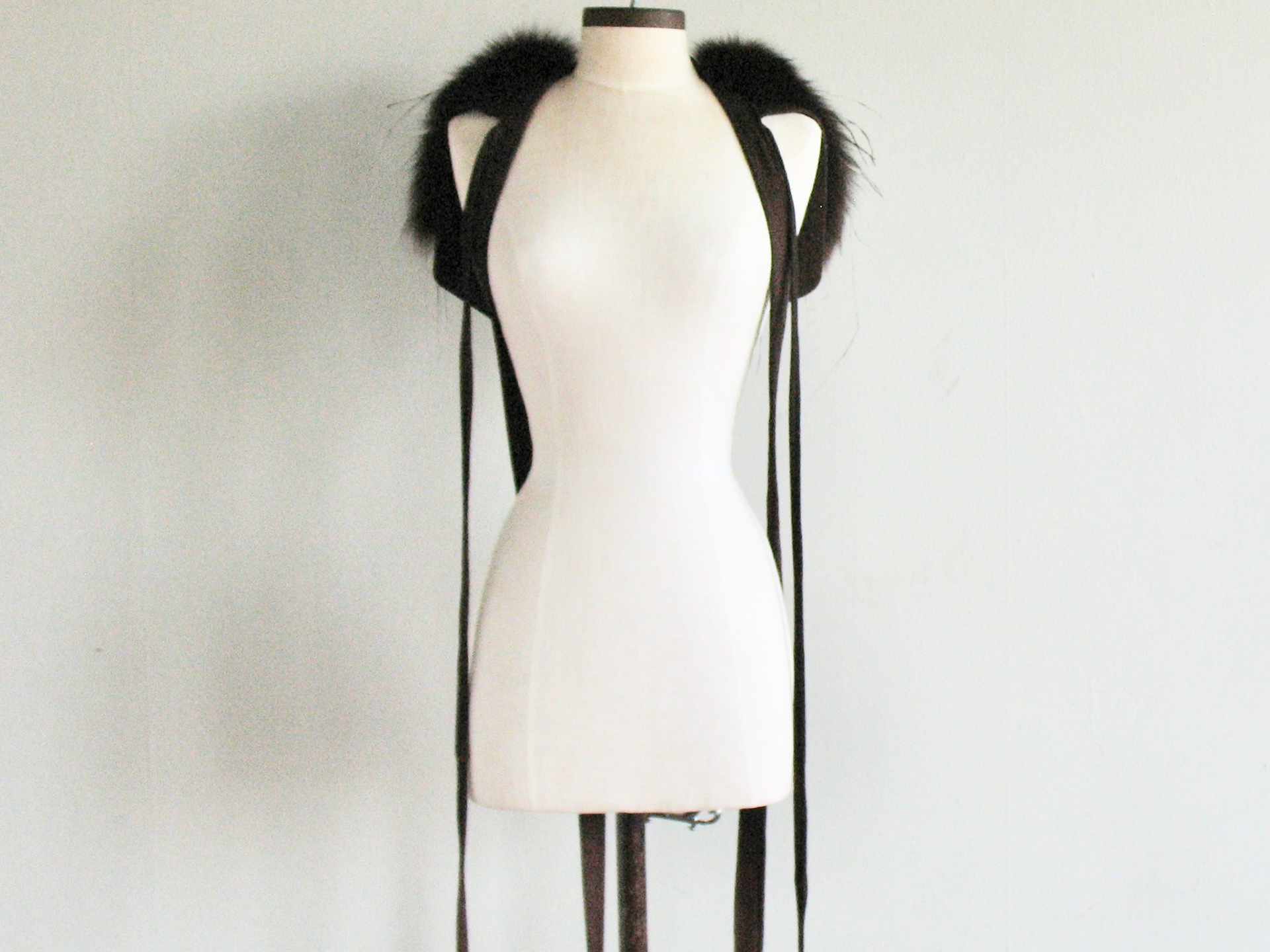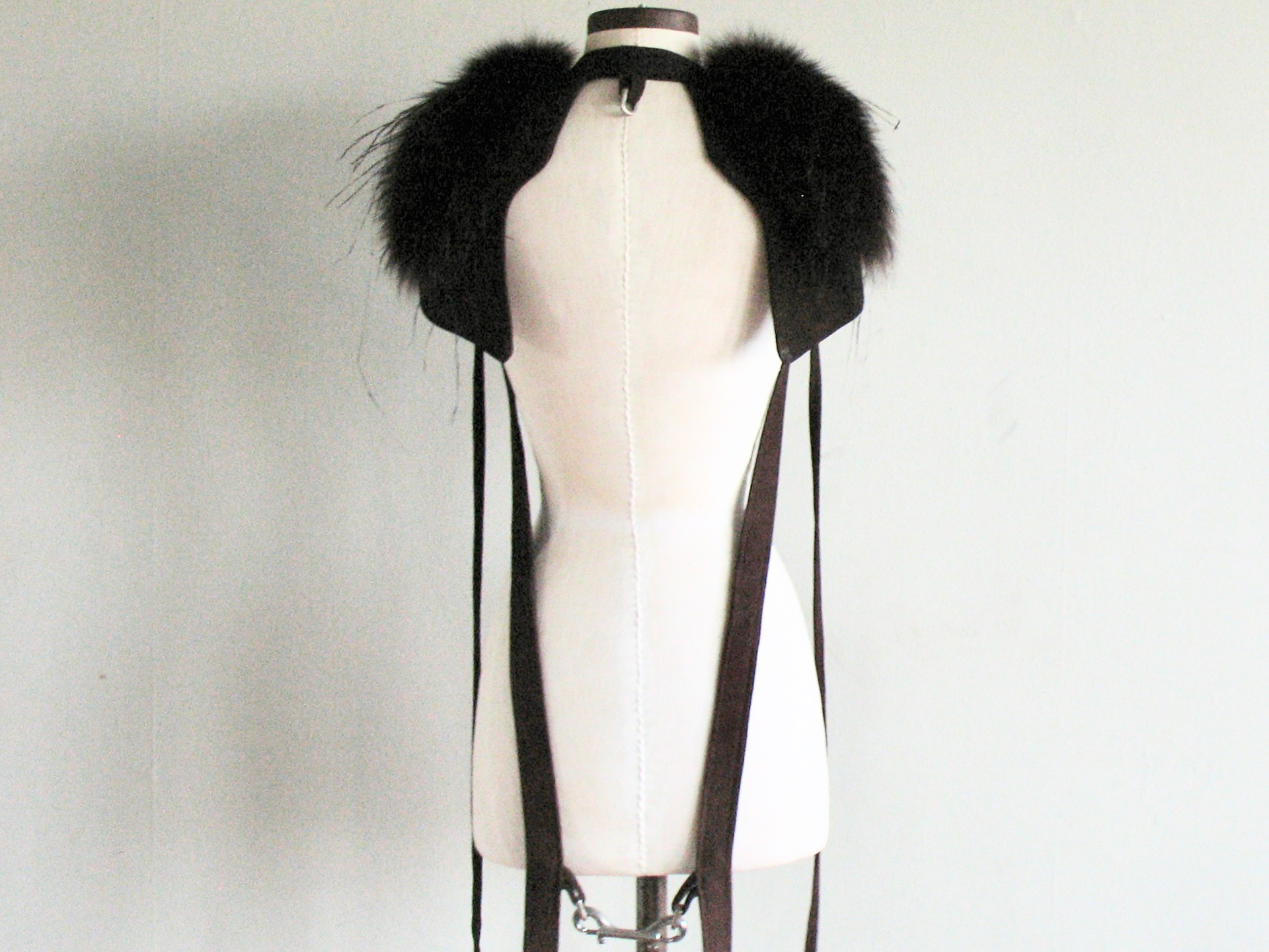 • Leather panels with overlaid fox fur and ostrich feathers