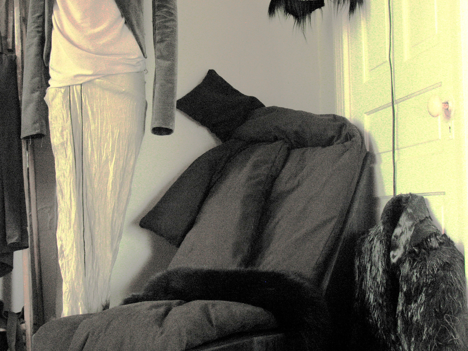 For the cushioning, I wanted to find fabric that felt lush yet cozy and decided on a felted wool. To get the desired cushion shape, I recycled a thrifted comforter. Pine was used for the wood component, paired with a dark walnut stain.