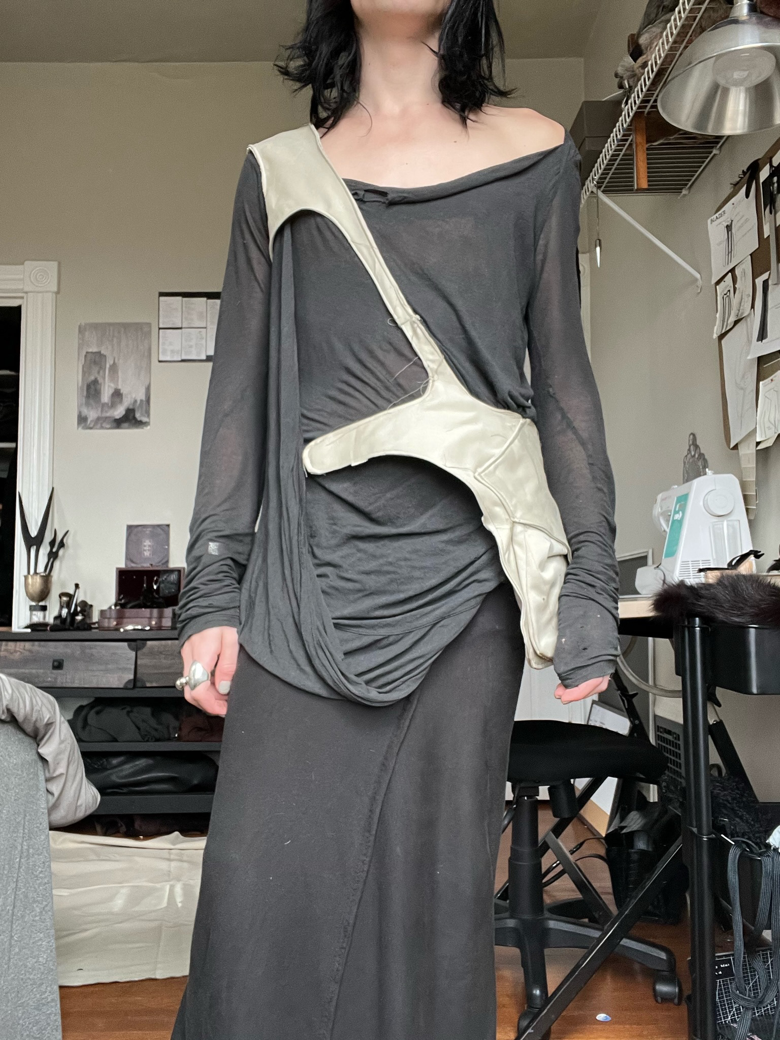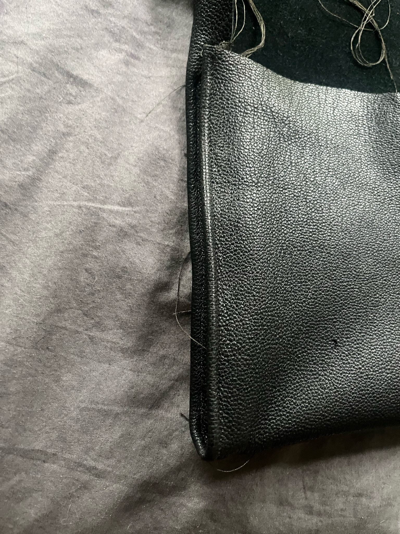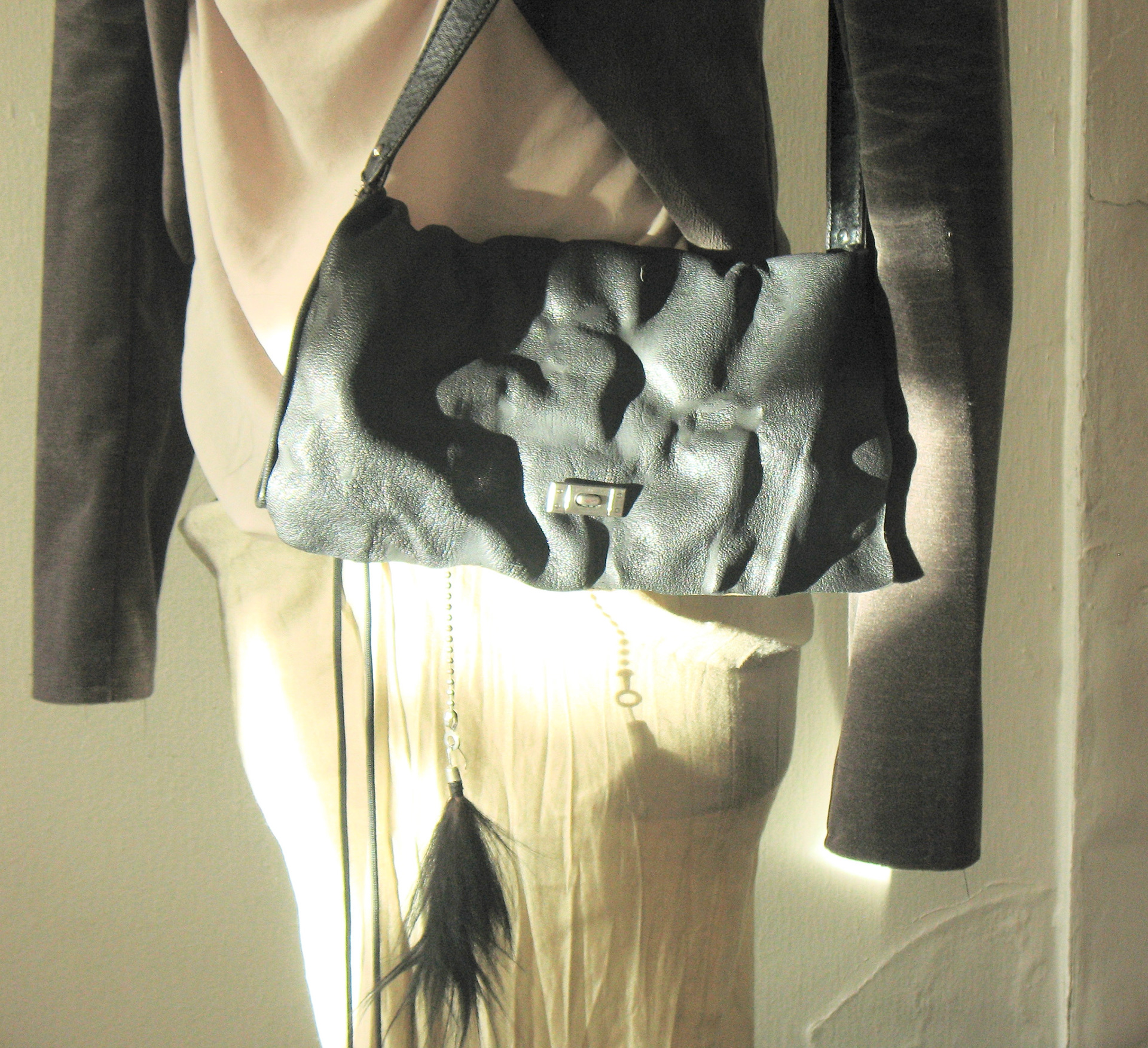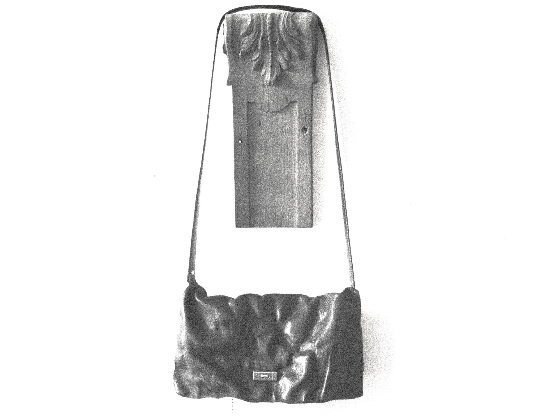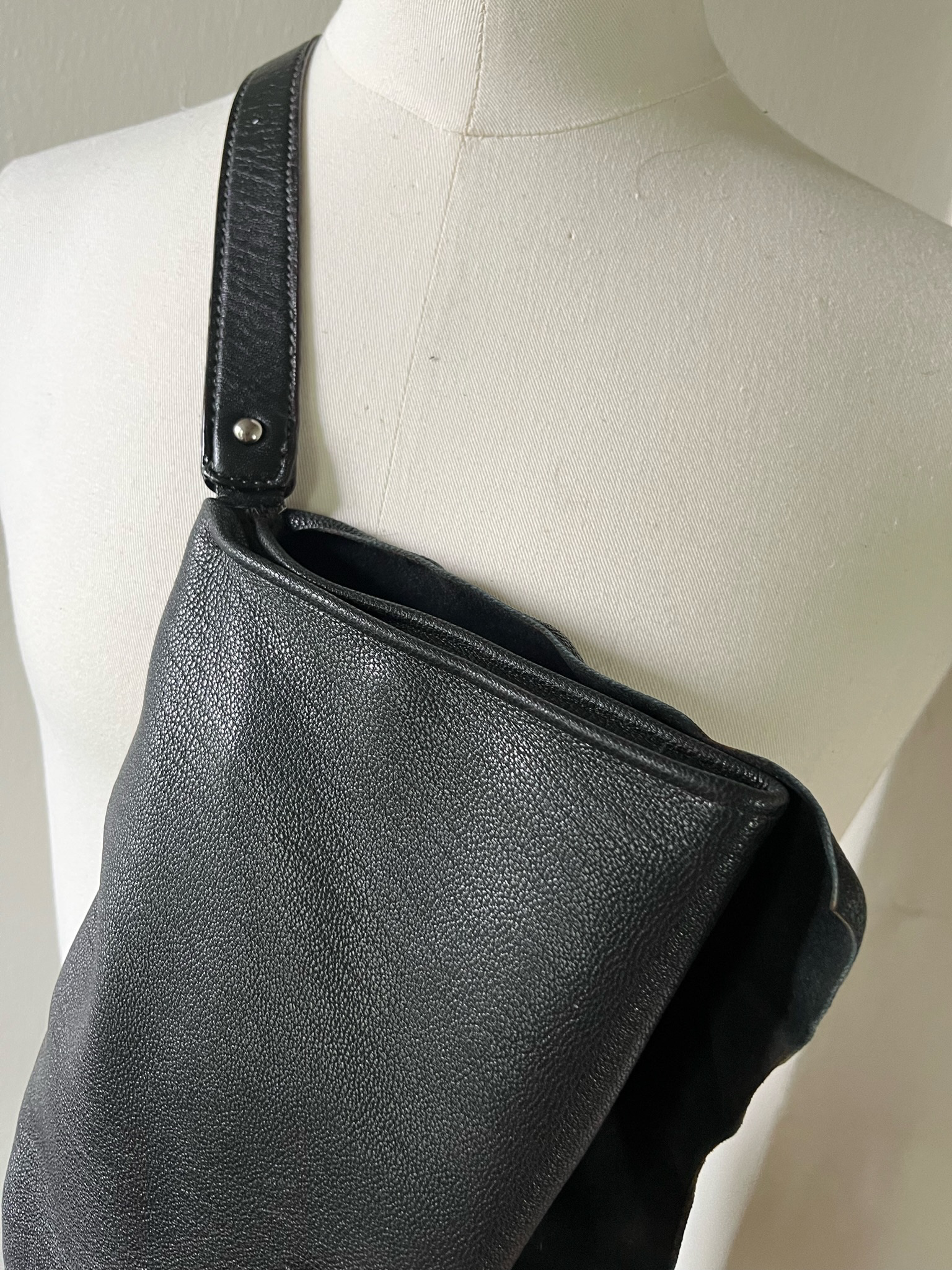 Inspired by photos of old, worn, and forgotten leather, this bag is comprised of a recycled 1930's bomber jacket.